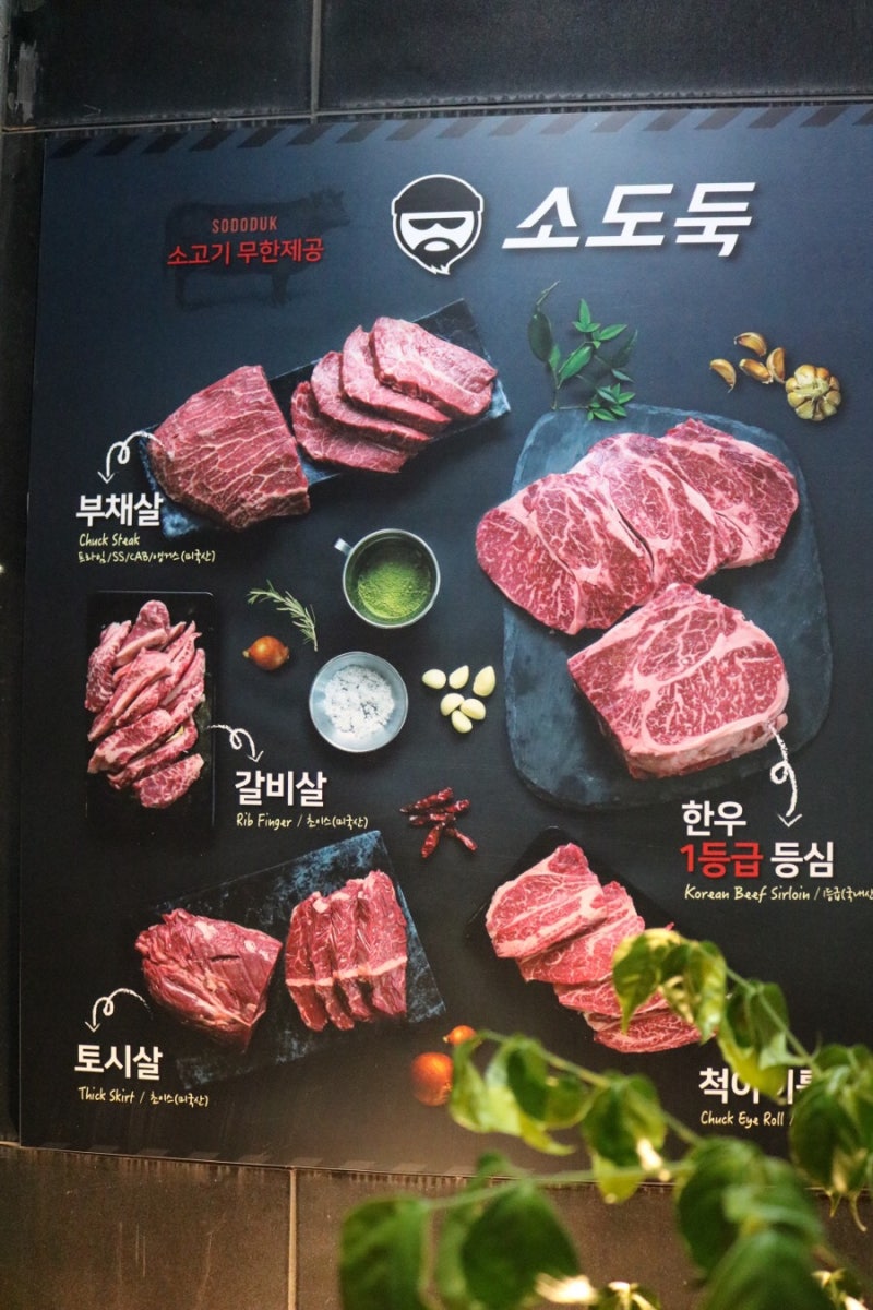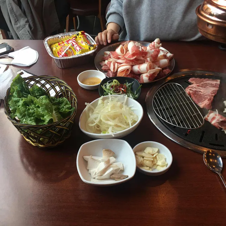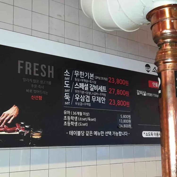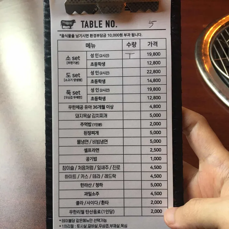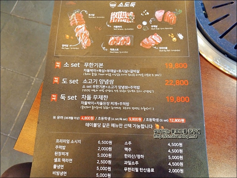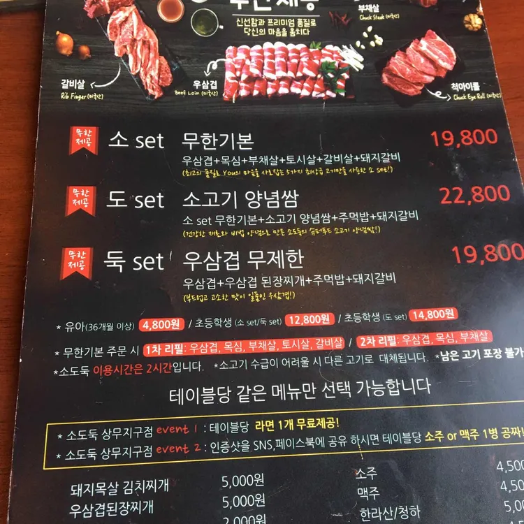 메뉴입니다 초 set 22,800소 장미+목심+소 앞다리+소의 갈비 뼈 위의 고기+돼지 갈비도 set 25,800초 set+소 양념 샘+주먹밥+돼지 칼비도우크 set 22,800소 장미+소 삼겹살 된장 찌개+주먹밥+돼지 갈비 이용 시간은 2시간이지만 십분이었어요!그리고 테이블을 라면도 1개씩 무료로 제공됩니다