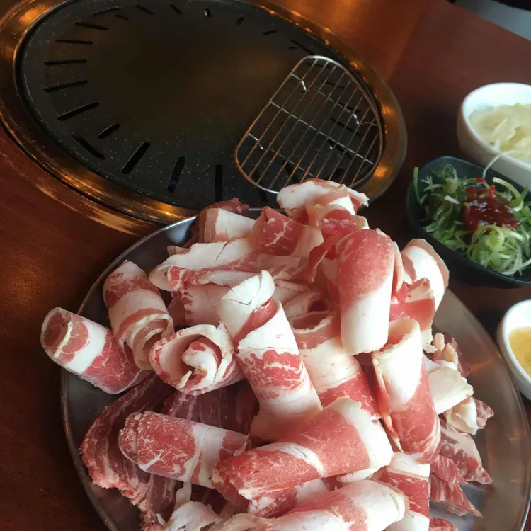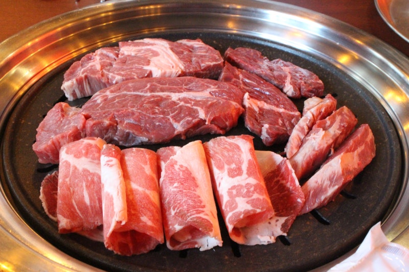 우리는 소고기 무한리필을 2명 주문했습니다 오늘 배부르게 먹어보기로 결심했어요 처음부터 벨트를 풀었어요