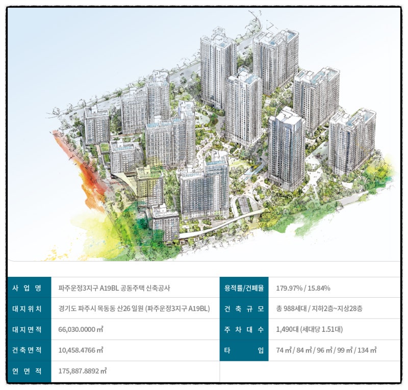 청약일정은 11월 13일 특별공급, 14일 1순위, 15일 2순위 접수로 진행되며 당첨자 발표는 21일입니다. 서류 접수 기한이 24일~27일까지 다른 현장에 비해 조금 짧습니다. 정당 계약일은 12월 4일~12월 7일입니다. 파주운정 분양일정 참고해주세요.청약 전에 꼭 확인해야 할 사항입니다. 1순위 청약조건은 청약통장 가입기간 12개월 이상 예치금(지역별, 면적별)을 충족해야 합니다. 모집공고일 기준 파주시(경기도, 서울, 인천)에 거주자로 세대주와 세대원, 만 19세 이상, 주택소유 여부에 관계없이 1순위 청약이 가능합니다. 파주 아파트 분양 85㎡의 예치금은 다음과 같습니다.